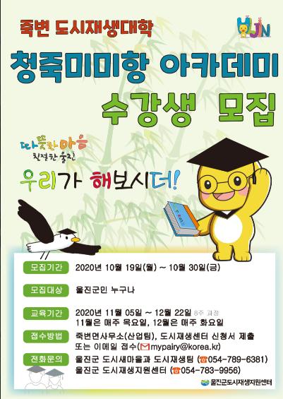 울진군 및 울진군도시재생지원센터는 지속가능한 도시재생사업 실현을 위한 인적자원 발굴과 전문 인력 육성을 위해 19일부터 30일까지‘죽변면 청죽미미항 아카데미’수강생을 모집한다.