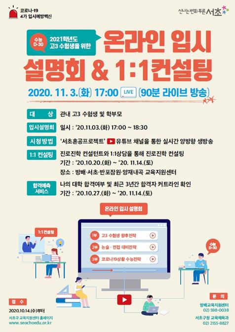또한 12월 3일에 치러지는 수능시험 종료 후에도 서초구의 차별화된 대입 지원전략을 제공하여 학생들의 대학진학 및 진로선택에 도움을 줄 수 있도록 “2021학년도 대입 정시 지원전략 설명회”를 오는 12월 5일(토) 개최할 예정이다.