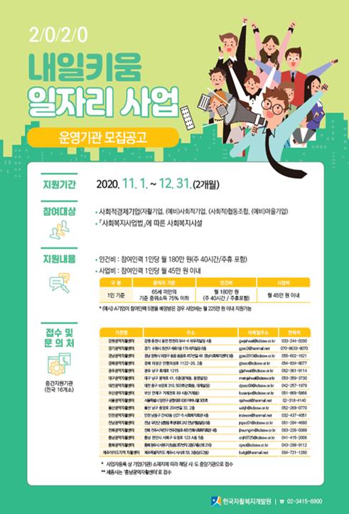 ‘내일키움일자리사업’은 코로나19 장기화에 따라 시행되는 정부의 2차 긴급재난지원사업이며, 참여대상은 65세 미만의 기준 중위소득 75%이하 저소득층으로 현재 자활근로 및 재정지원 일자리 사업에 참여하고 있지 않아야 한다.