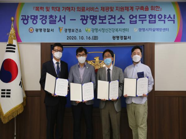 광명시는 16일 광명경찰서, 광명시자살예방센터, 광명시정신건강복지센터와 폭력 및 학대 가해자의 재발 방지를 위한 ‘의료서비스 제공 및 지원체계 구축 업무협약’을 체결했다.