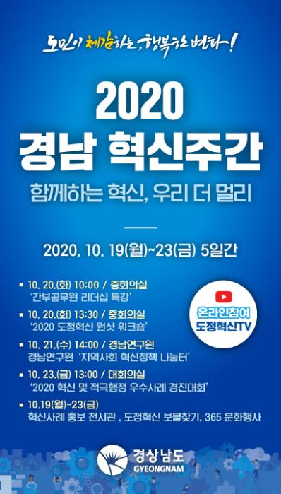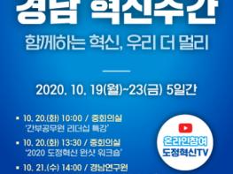 경상남도가 ‘함께하는 혁신 우리 더 멀리’라는 슬로건으로 10월 19일부터 23일까지 총 5일간 도청 일원 서 ?경남 혁신주간’을 개최한다.