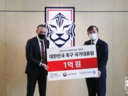 파울루 벤투 감독이 이끄는 축구 국가대표팀이 올림픽대표팀과의 스페셜 매치에서 승리해 획득한 1억원을 코로나19 극복을 위해 사용해달라며 국립중앙의료원에 기부했다.