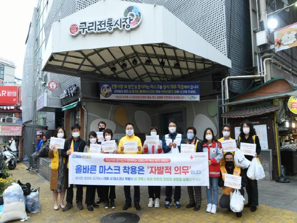구리시는 지난 16일 대한적십자사봉사회 구리지구협의회 주관으로 함정현 적십자회장 등 20여명이 참여한 가운데, 구리전통시장에서 코로나19 확산방지를 위한 마스크 착용 의무화 캠페인을 전개했다.