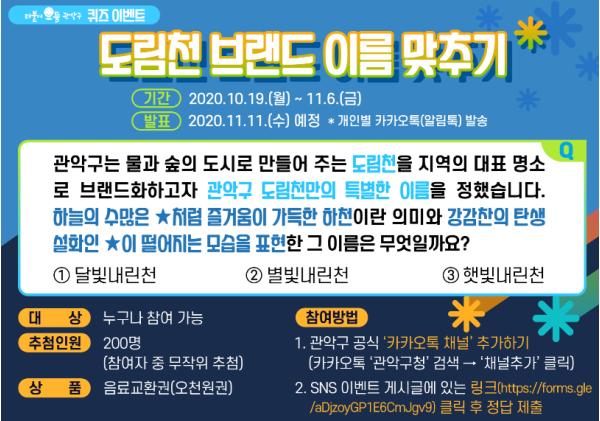 ‘도림천 브랜드 이름 맞추기’ S.N.S 이벤트와 관련한 더 자세한 내용은 관악구 홈페이지 및 공식 S.N.S채널(인스타그램, 페이스북, 카카오스토리 등)에서 확인할 수 있다.