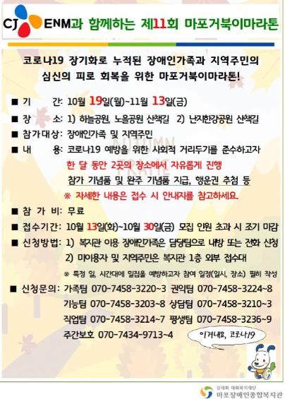 ‘마포거북이마라톤’은 장애인의 날 40주년을 기념해 마포장애인종합복지관(관장 이명자) 주관으로 10월 19일부터 다음달 13일까지 진행된다.