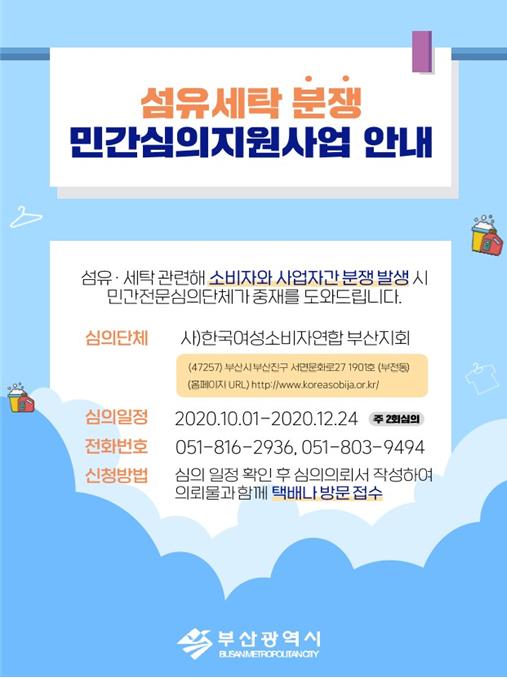 이에 부산시는 사)한국여성소비자연합 부산지회를 통해 섬유·세탁 관련 소비자피해를 적극 중재하고, 시민들의 불편을 해소한다는 방침이다.