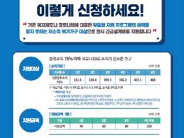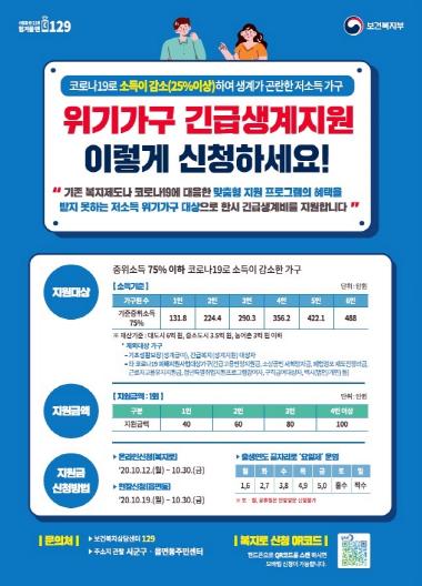 위기가구 긴급생계지원금은 코로나19 여파로 소득이 25%이상 감소하고, 가구원 전체 소득의 합이 기준 중위소득 75% 이하이며, 재산 6억 이하인 가구가 대상이다.