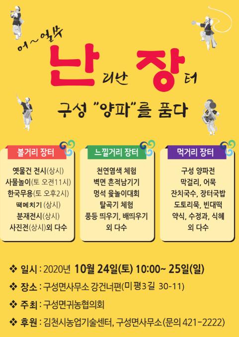 구성면귀농협의회는 오는 24~25일 김천시 구성면사무소 강건너편 일원(미평3길 30-11)에서 ‘구성 “양파”를 품다’ 주제로 난장(난리난 장터) 행사를 개최한다.