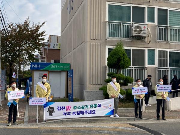 아포읍 직원일동은 이른 아침부터 인근 구미 등으로 출근하는 시민들을 대상으로 현수막과 피켓을 통해 「김천愛 주소 갖기」운동을 홍보하고, 각 세대 우편함에 ‘전입자 가이드북-슬기로운 김천생활’을 배포하여 인구 전입을 독려하였다.