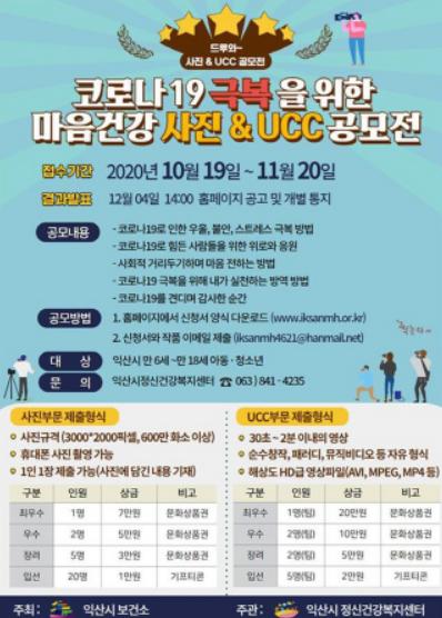 익산시 정신건강복지센터는 19일부터 11월 20일까지 코로나19 극복을 위해 아동·청소년들을 대상으로‘코로나19 극복과 마음건강을 위한 사진 & UCC공모전’을 비대면 온라인으로 실시한다.