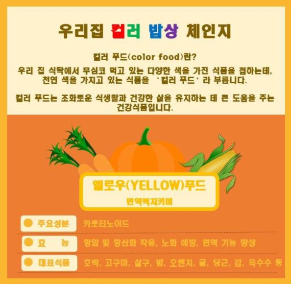 우리 집 컬러 밥상 체인지는 11월 첫째 주를 시작으로 12월까지 진행할 예정이다. 총 6차시에 걸쳐 식품 고유에 빛깔인 6가지 컬러(빨강, 노랑, 초록, 보라, 검정, 흰색)를 주제로 진행된다.