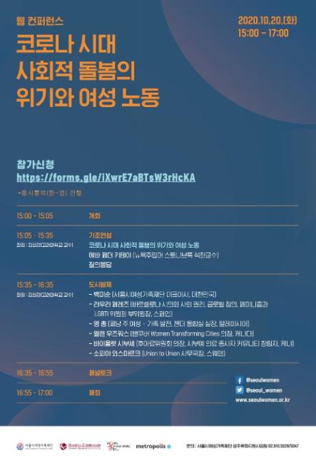 10월 20일(화), 코로나19 확산에 따른 ‘노동시장의 성차별과 여성에게 가중된 돌봄’ 문제의 현황과 대응 전략을 공유하기 위해 미국, 스페인, 말레이시아, 한국 등 7개국에서 도시 정책 전문가, 여성 정책 전문가, 국제기구, NGO 관계자들이 모여 웹 컨퍼런스를 개최한다.