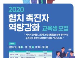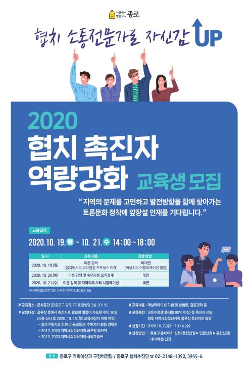 종로구는 오는 10월 19일(월)부터 21일(수) 3일간 문화공간 온(종로77 통일빌딩 3층)에서 「2020 협치 촉진자 역량강화 교육」을 운영하고 지역문제 해결과 발전방향을 함께 찾아갈 수 있는 시간을 갖는다.