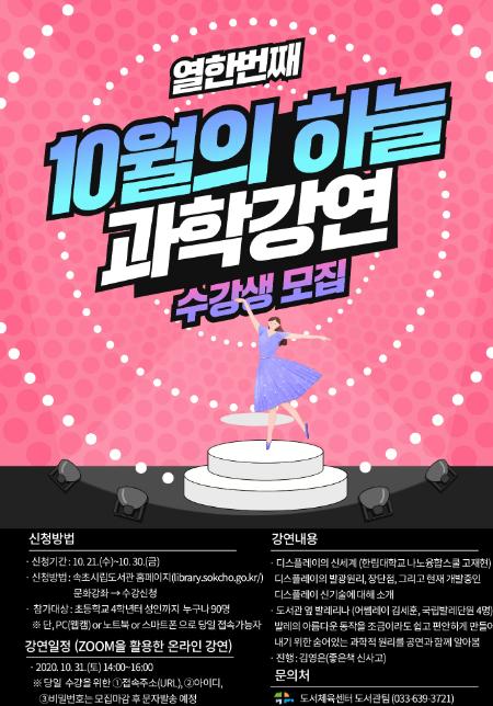 속초시립도서관에서 진행되는 ‘10월의 하늘’ 과학강연에는 한림대학교 나노융합스쿨 고재현 교수와 어?레이 김세훈 대표·국립발레단원 4명의 재능기부를 통해 진행된다.