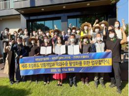 도 농업기술원 제주농업기술센터는 17일 표선면 소재 환이정에서 두 기관과 함께 제주 농가공품 수출판매 활성화를 위한 업무 협약을 체결했다고 밝혔다.