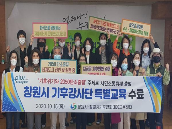 창원시가 주최하고 창원시 기후변화대응교육센터가 주관한 이번 교육은 기후변화를 넘어 기후위기 시대에 본격적인 시민인식교육에 나설 기후강사단을 선발하고자 창원시 그린리더를 대상으로 10월 7일부터 15일까지 총 15시간의 특별교육을 진행하였으며, 교육이수자 14명에게 수료증을 전달했다.