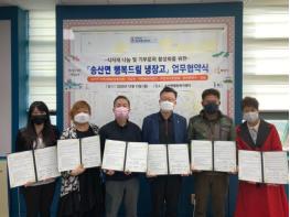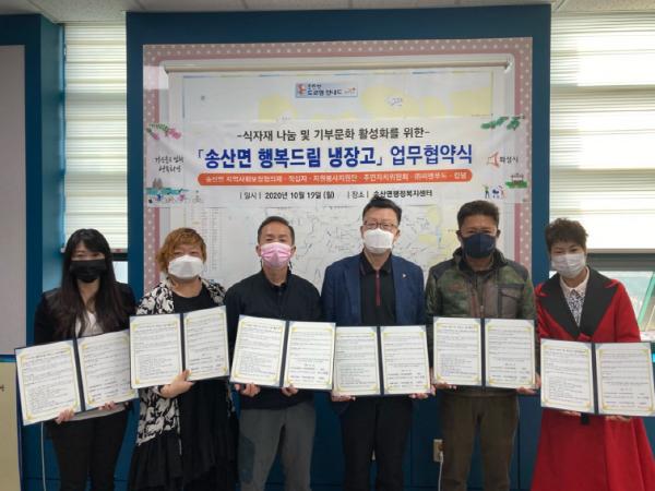 송산면은 19일 지역사회보장협의체, 적십자, 자원봉사지원단, 주민자치위원회, ㈜씨엔푸드, 킹덤 총 6개 기관과 협약을 체결하고 매주 화요일마다 다양한 음식들을 냉장고에 채우기로 했다.