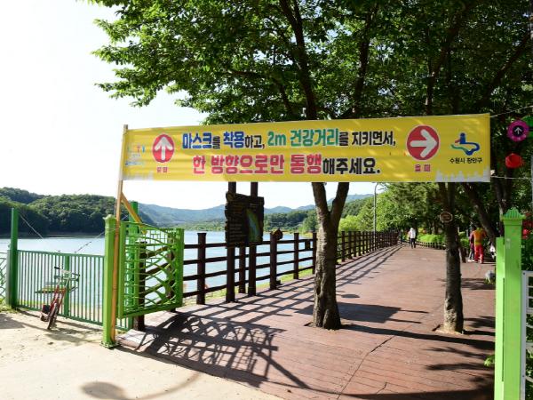 광교산, 칠보산, 청명산 등 시민들이 많이 찾는 산의 등산로에는 ‘마스크 의무착용’ 안내 현수막 150장을 게시했고, 15개소에는 손 소독제를 비치했다. 산불감시원을 활용해 등산객들에게 방역 수칙을 홍보할 예정이다.