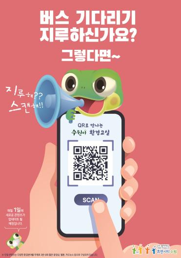 수원시는 무선 인터넷(WiFi)이 설치된 버스정류장 30개소에 참여 큐알코드를 부착했다. 스마트폰으로 큐알코드를 스캔하면 ‘QR코드로 만나는 수원이 환경교실’ 네이버 블로그로 이동해 교육 영상을 볼 수 있다.