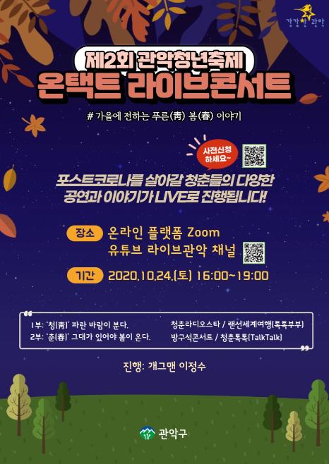 2019년에 이어 두 번째로 개최되는 이번 축제는 개그맨 이정수의 사회로 ▲청년 아티스트들의 공연과 사연을 접목한 청춘 라디오스타 ▲랜선 세계여행 강의 ▲청년예술가들에게 공연기회를 제공하는 방구석콘서트 ▲코로나 시대에 청년으로 살아가는 것을 주제로 한 청춘톡톡(Talk Talk) 등 다양한 프로그램으로 구성될 예정이다.