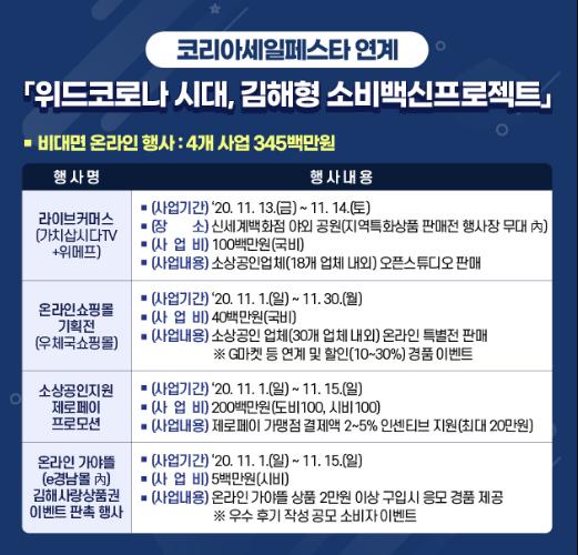 코리아세일페스타는 유통, 제조, 서비스 기업의 세일행사가 한데 모인 민간주도의 대한민국 대표 쇼핑할인행사이며 김해형 소비백신프로젝트는 온·오프라인 10개 세부사업으로 진행된다.