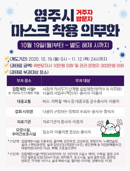 경북 영주시는 지난 19일 ‘코로나19’ 확산방지를 위해 시내 전 지역 거주자와 방문자에 대해 ‘마스크 착용 의무화’ 행정명령을 발령했다.