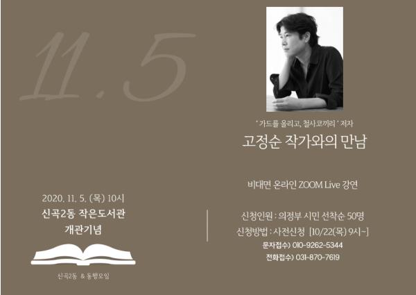 코로나-19 감염 방지를 위해 비대면(zoom 라이브방송)으로 운영되는 강연회는 의정부시민이면 누구든지 참여할 수 있고, 10월 22일 오전 9시부터 선착순 50명을 모집할 예정이다. 신청 방법은 신곡2동 작은도서관에 전화(870-7619) 또는 문자를 통해 가능하다.