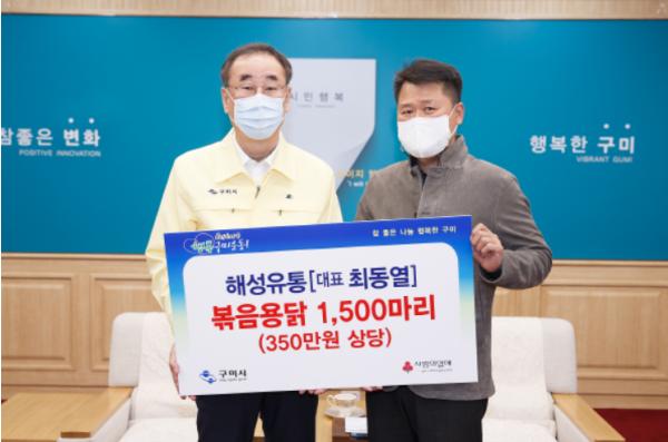 장세용 구미시장은 “어려운 시기에 따뜻한 마음을 보내주신 해성유통에 감사드리며 기탁해주신 닭고기는 사회복지시설 및 취약계층에 큰 힘이 될 것”이라고 전하였다.