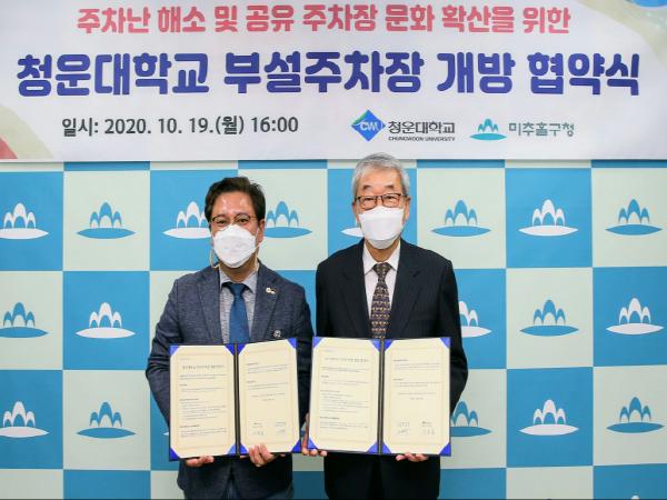 인천 미추홀구(구청장 김정식)는 19일 청운대학교 부설주차장 개방을 위한 업무협약을 체결했다.