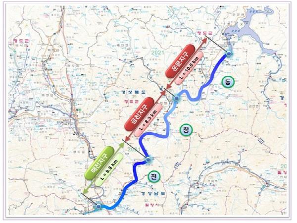 「동창천 운문지구 자연재해위험개선지구 정비사업」은 사업비 482억원 으로 매전면 호화리에서 금천면 임당리까지 하천정비 10㎞, 교량개체 4개소 등을 정비할 계획이다.