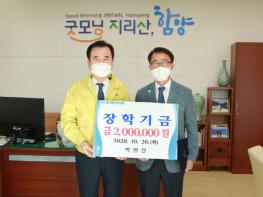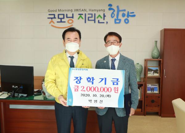 함양군은 20일 박영진 함양산삼엑스포조직위원회 기획본부장이 지역사랑을 담아 (사)함양군장학회에 장학금 200만원을 기탁했다고 밝혔다.