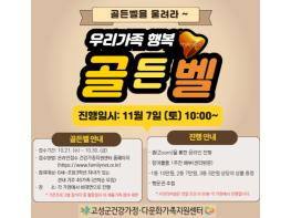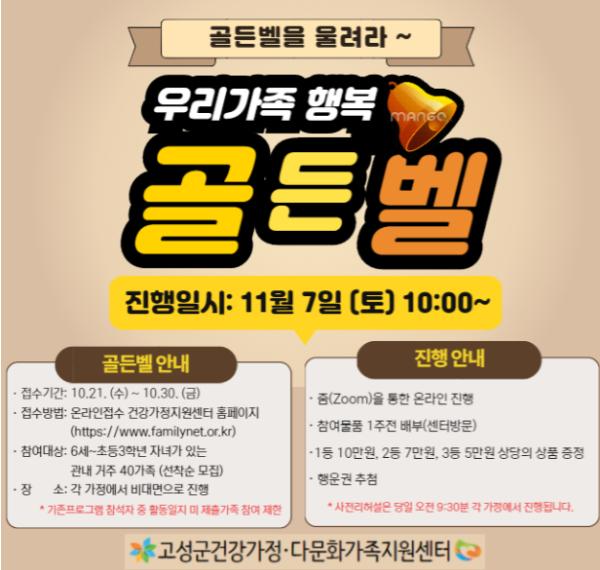 고성군은 고성군건강가정·다문화가족지원센터주관으로 11월 7일 오전 10시에 관내 초등학생 자녀를 둔 40가족을 대상으로 『우리가족, 도전! 행복 골든벨』을 온라인으로 개최한다고 밝혔다.