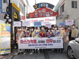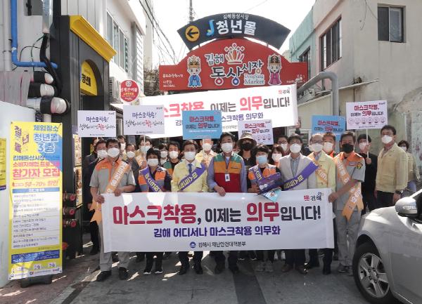 허성곤 김해시장을 비롯한 김해시 간부공무원들이 마스크 착용 의무화 홍보를 위해 거리로 나섰다.