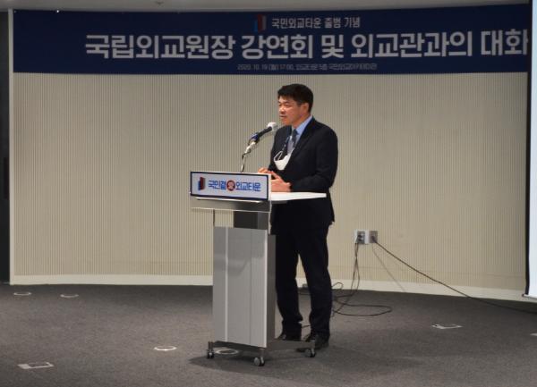 국립외교원은 10.19일 17시 외교타운 5층 국민외교아카데미관에서 국민외교타운 출범을 기념하여 국립외교원장 강연회 및 외교관과의 대화를 개최하였다고 밝혔다.