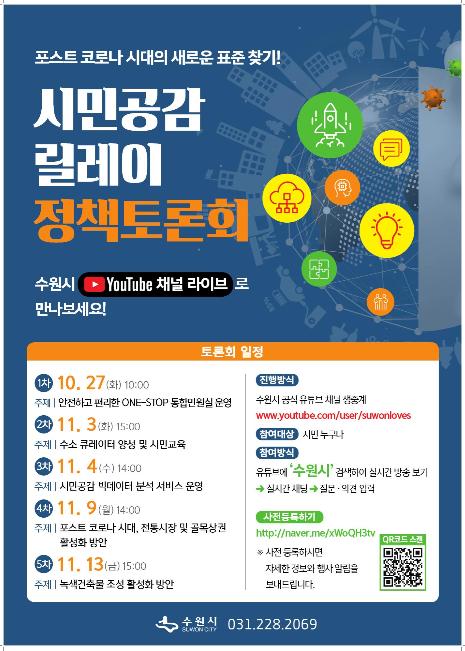 수원시가 ‘포스트코로나 시대’의 새로운 표준을 선도할 정책과제를 발굴하는 ‘시민 공감 릴레이 정책토론회’를 연다.