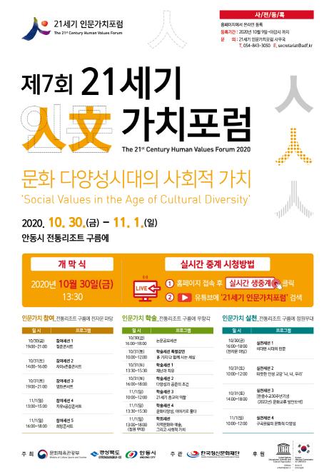 올해로 7회째를 맞는 ‘21세기 인문가치포럼’은 문화체육관광부, 경상북도, 안동시가 공동주최하고, 한국정신문화재단이 주관하며 유네스코한국위원회가 후원하는 포럼으로, 올해는 문화적 차이에서 오는 주요 갈등을 해소하는 방법으로 타 문화의 이해, 다양성의 가치를 제시하며, 사람 중심의 사회를 구현하기 위하여 다양성을 관통하는 사회적 가치를 모색하는 프로그램으로 구성되었다.