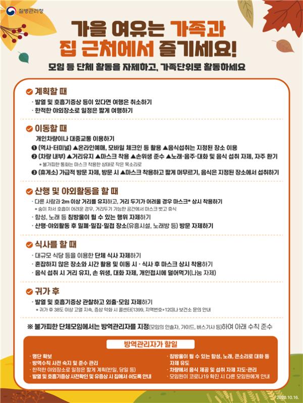 인천광역시는 가을 단풍철을 앞두고 여행객 증가에 따른 코로나19 감염·확산 예방을 위해 시민들에게 “단체 여행을 자제하고, 가족과 집 근처에서 가을 여유를 즐겨달라”고 당부했다.