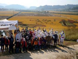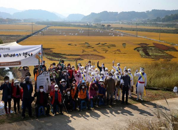 서천군 종천면은 지석리 서부저수지 인근에 조성한 논 그림의 벼 베기 행사를 지난 20일 진행했다고 밝혔다.