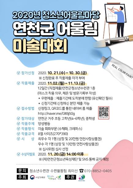 (재)연천군청소년육성재단에서는 10월 21일부터 10월 30일까지 2020년 청소년어울림마당 ‘연천군 어울림 미술대회’ 참가자를 모집한다고 밝혔다.