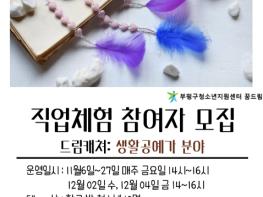 체험은 오는 11월 6일부터 12월 4일까지 매주 금요일마다 진행되며, 12월 2일에도 한 차례 더 열린다. 총 6회에 걸쳐 방역지침을 준수해 진행할 예정이며, 교육 장소는 부평구 학교 밖 청소년지원센터다.