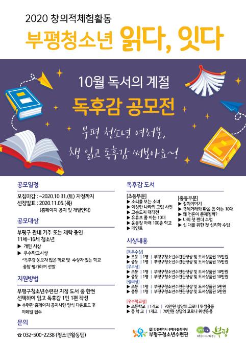 부평구 청소년수련관은 오는 31일까지 지역의 11세~16세 청소년을 대상으로 ‘부평청소년 읽다, 잇다’ 독후감 공모전을 진행한다.