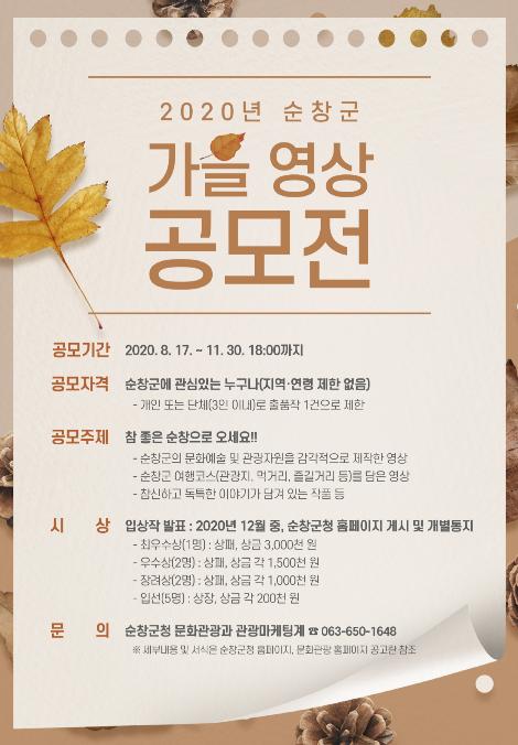 순창군이 개최하는 ‘2020년 순창군 가을 영상공모전’ 접수기한이 한 달 앞으로 다가왔다. 이번 공모전은 순창군이 주관하며 순창의 문화와 관광 전반에 대해 창작 영상물 발굴과 홍보에 활용하고자 마련했다. 공모전 접수는 다음달 30일까지다.