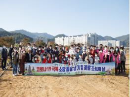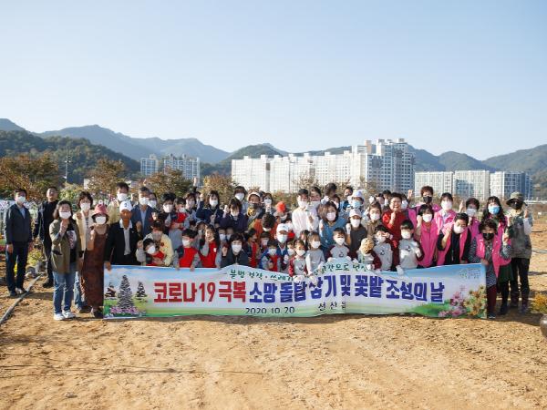 선산읍에서는 2020. 10. 20(화) 16:00 선산읍 교리 2지구 일원에서 구미시장, 이정숙(前구미대학교 조경과 교수, 現인성교육문화진흥원 이사장), 자원봉사자(농업기술센터 도시농업관리사 과정 수료자), 관내 2개소 유치원 아이들, 관내 유관기관단체장 등 100여명이 참석한 가운데 『주민 참여형 “마음행복 꽃밭” 가꾸기』시작의 첫 발을 내딛었다.
