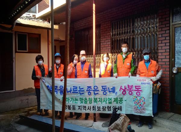 이날 상봉동 지역사회보장협의체 위원 등 21명이 참여하여 지붕기둥에 고여 있는 물을 빠지게 하고 물받침을 설치하는 등 생활이 어려운 저소득층 가정에 맞춤형 복지서비스를 실시하였다.