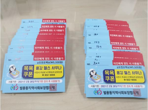 이번 목욕쿠폰 지원 사업은 올해 3년째로 벌용동지역사회보장협의체 위원인 김갑연 용강헬스사우나 대표가 해마다 어려운 이웃을 위하여 나눔을 실천하는 사업으로, 올해는 220만 원 상당의 쿠폰을 경제적인 어려움과 취약한 주거공간으로 목욕이 어려운 저소득가정 40세대에게 지원하여 목욕탕을 이용할 수 있도록 하였다.