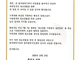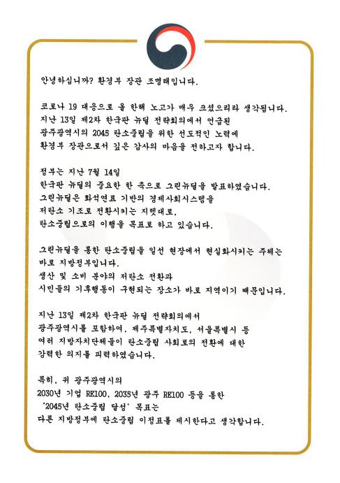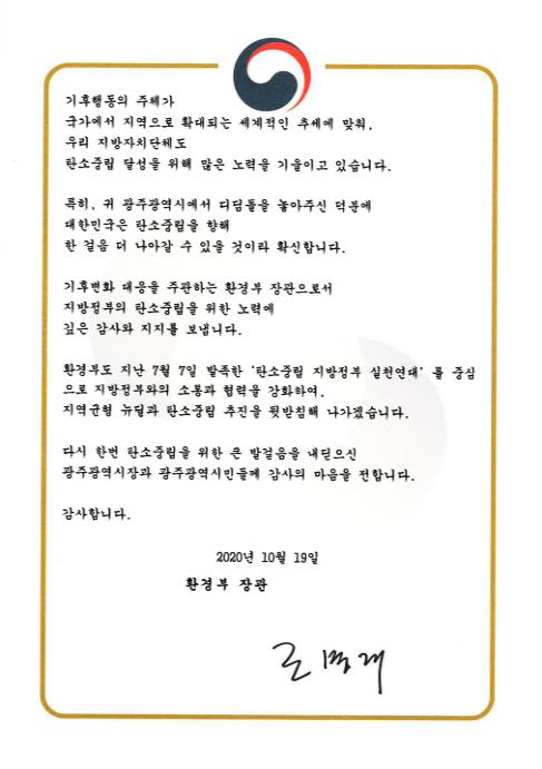 조명래 환경부장관이 2045년 탄소중립을 위한 광주광역시의 선도적인 노력에 감사와 지지의 뜻을 담은 감사 서한을 보내왔다.