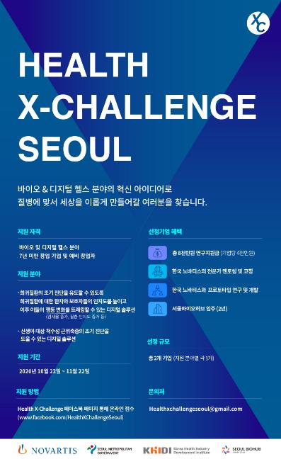 서울시는 한국노바티스(대표 조쉬 베누고팔, Joshi Venugopal)와 바이오 및 디지털헬스 분야의 우수기업을 발굴하는 ‘헬스엑스챌린지 서울(Health X-Challenge Seoul)’을 공동 개최한다고 밝혔다. 총 2개 기업을 선발해, 서울바이오허브 입주권과 한국노바티스의 집중 멘토링 등 해외진출 지원을 위한 다양한 기업성장 프로그램을 지원한다.