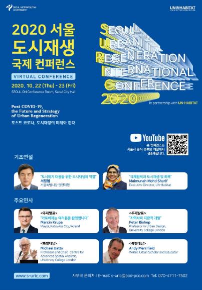 서울시가 ?포스트 코로나, 도시재생의 미래와 전략(Post COVID-19, the Future and Strategy of Urban Regeneration)?을 주제로 한 ‘2020 서울 도시재생 국제 컨퍼런스’를 10.22(목)~23(금) 양일 간 개최한다. 온라인 화상회의로 진행되며, 서울시 공식 유튜브 채널(국·영문)을 통해 실시간 생중계된다.
