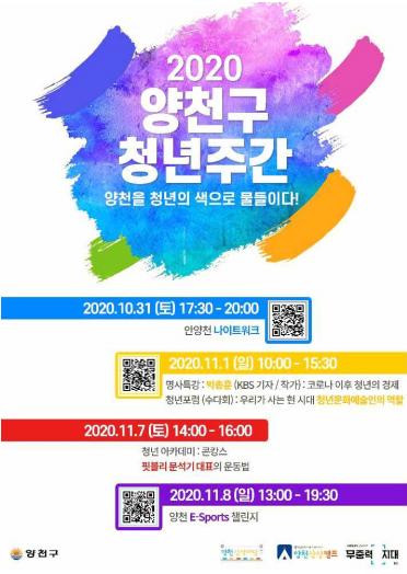 명사로부터 듣는 특강과 청년포럼도 마련돼 있다. 11월 1일 일요일 10시 사 회적경제지원센터 창업디딤누리에서 소규모 인원을 중심으로 KBS 박종훈 기자 의 “코로나19 팬데믹 이후 청년 세대의 경제 생존 전략 특강”을 진행하며, 양 천구청 유튜브 채널을 통해 실시간으로 시청할 수 있다. 같은 날 오후 2시 서 울창업카페 양천신정점에서는 “우리가 사는 현시대 청년 문화예술의 역할”을 주제로 청년연구가 및 청년들의 의견을 교류하는 청년포럼이 개최된다.