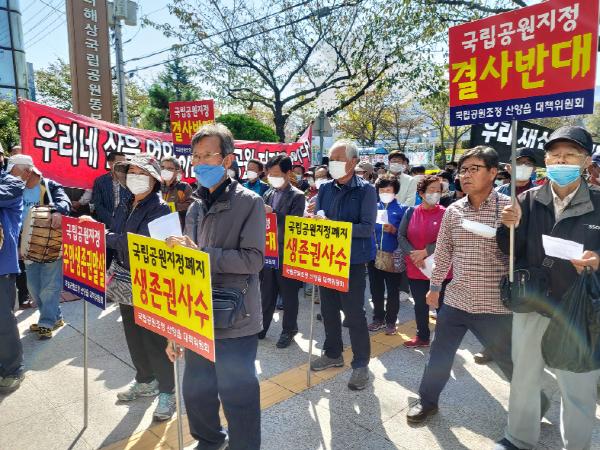 통영시 산양읍 주민자치위원회와 산양읍 이장단 등 주민 100여 명이 참가한 국립공원조정산양읍대책위원회(위원장 유성조, 이하 대책위)는 10월 20일 11시 한려해상국립공원동부사무소 앞에서 국립공원 조정 및 추가 편입 반대 궐기대회를 실시했다.